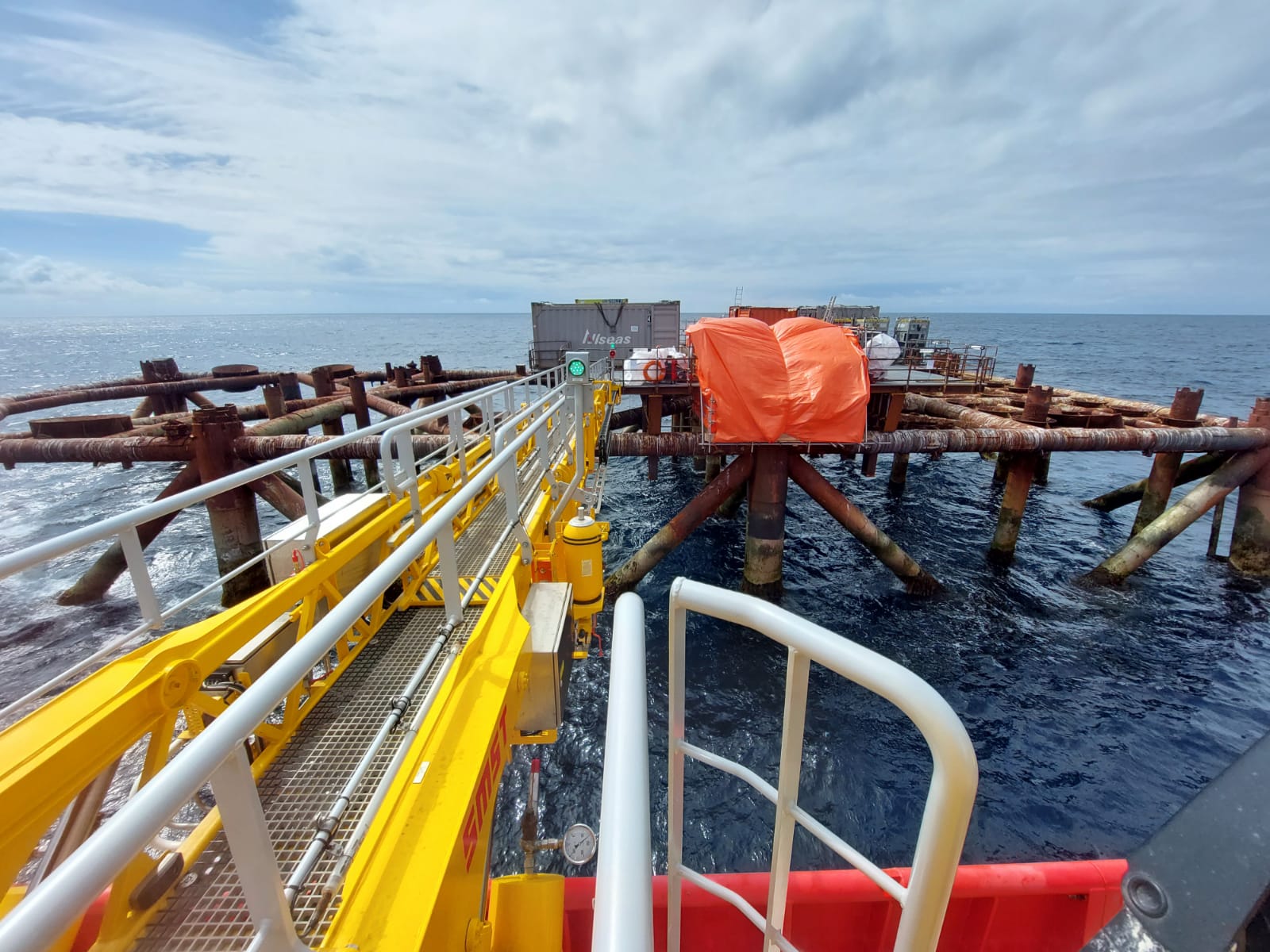 In July, the commissioning team of SMST mobilized the gangway, the Telescopic Access Bridge M-Series (TAB-M), on board of the offshore construction vessel Oceanic. The vessel provides construction support and accommodation for their crew that is preparing the eight-legged steel jacket for removal in this third phase of the project. “After successful operations in the second phase of the decommissioning, we have chosen the reliable gangway system of SMST to assist us once more”, says Jeroen van der Sman, Project Manager at Allseas.