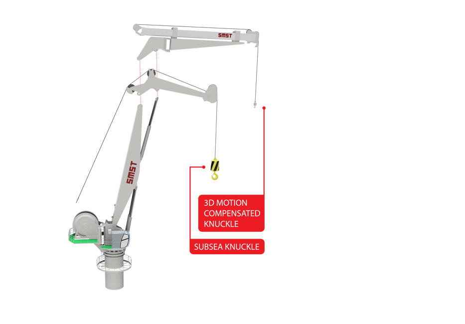 The SMST Offshore Crane is designed to easily exchange knuckles. The 3D motion compensated knuckle compensates the vessel's motions in all directions, whereas the subsea knuckle compensates by Active Heave Compensation (AHC).
